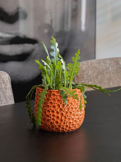 Κεραμικό κασπώ Drop Belly με γυαλωμένη επίστρωση σε πορτοκαλί απόχρωση και ανάγλυφη κυψελωτή υφή, διαστάσεων D15xH13 cm. Ιδανικό για μοντέρνες συνθέσεις & βιτρίνες ανθοπωλείων.